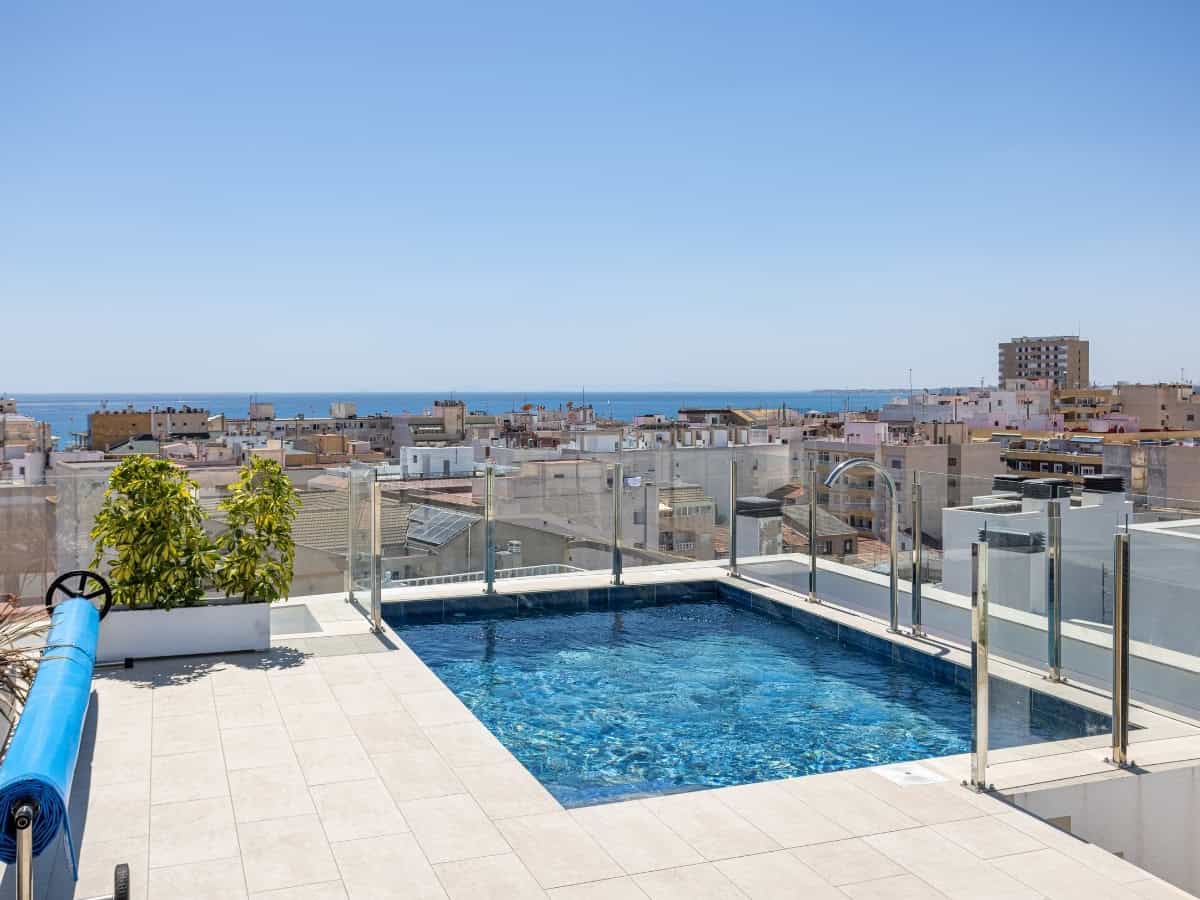 Gasten genieten van toegang tot een gemeenschappelijk zwembad op het dak, waar je de hele dag kunt genieten van panoramisch uitzicht terwijl je geniet van de Spaanse zon. Voor extra gemak zijn optionele ondergrondse parkering en een opslagruimte beschikbaar.